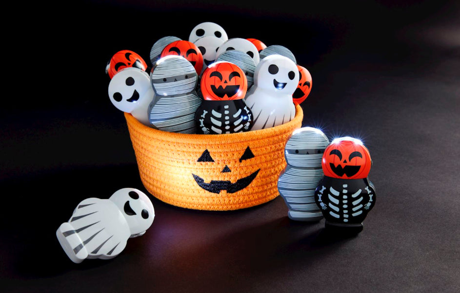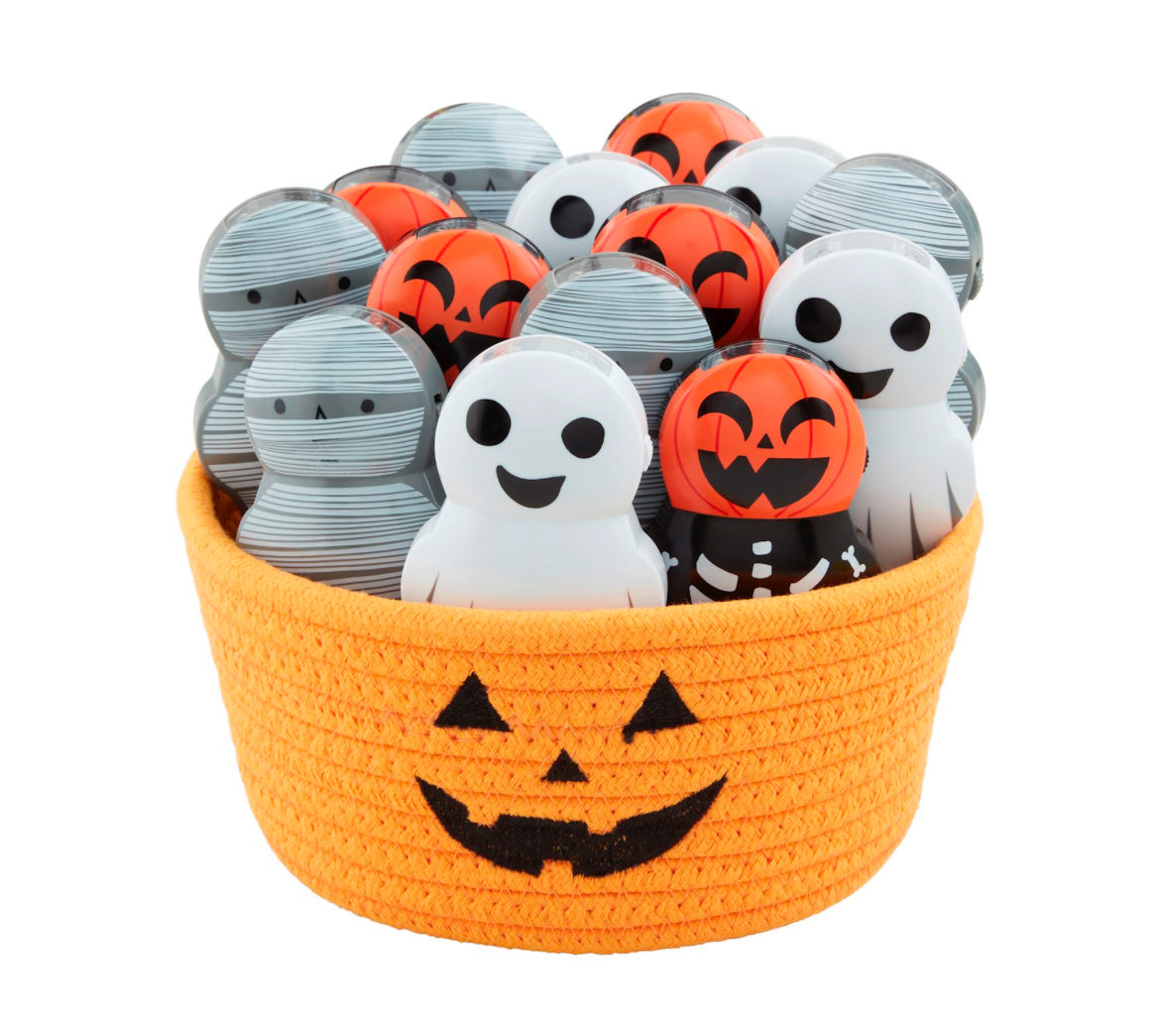 Character flashlight plays spooky musical sounds. Comes in cotton rope display basket. Requires 3 AAA batteries, included by sugar and spice.