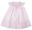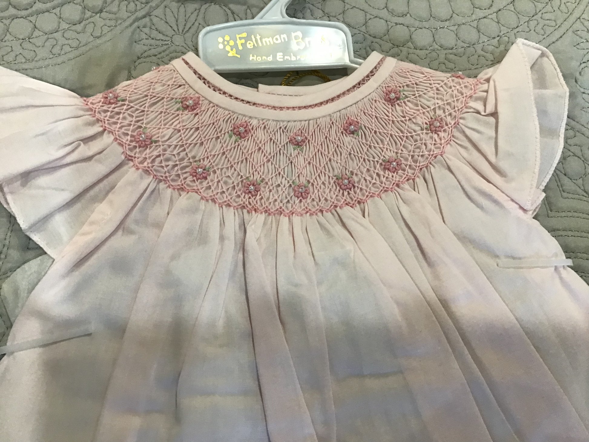 A charming bishop dress for girls with smocking, embroidery, and fly sleeves - what could be sweeter? Dainty fagoting lines the neck of this dress, followed by a smocked yoke, covered in a beautiful hand embroidered diamond design, embellished with tiny floral bullions with pearls in the center. Matching flower bullions adorn the hem, just above a soft scallop shaped feather stitch. The intricate details, soft colors, and sweet fly sleeves make it the perfect choice for any occasion - be it Easter, outings at the park, or days spent with family and friends. Another Feltman Brothers classic - sure to become a treasured family heirloom for generations!