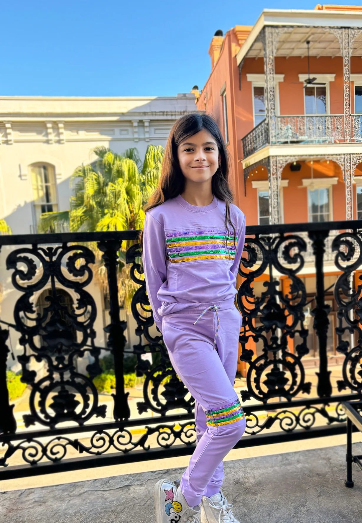 Elevate your little one's style game with our Youth Sequin Joggers French Terry! These Lavender joggers feature eye-catching purple, green, and gold sequin stripes along one leg, perfect for Mardi Gras celebrations. Complete the look with our matching top for a fun and festive outfit.