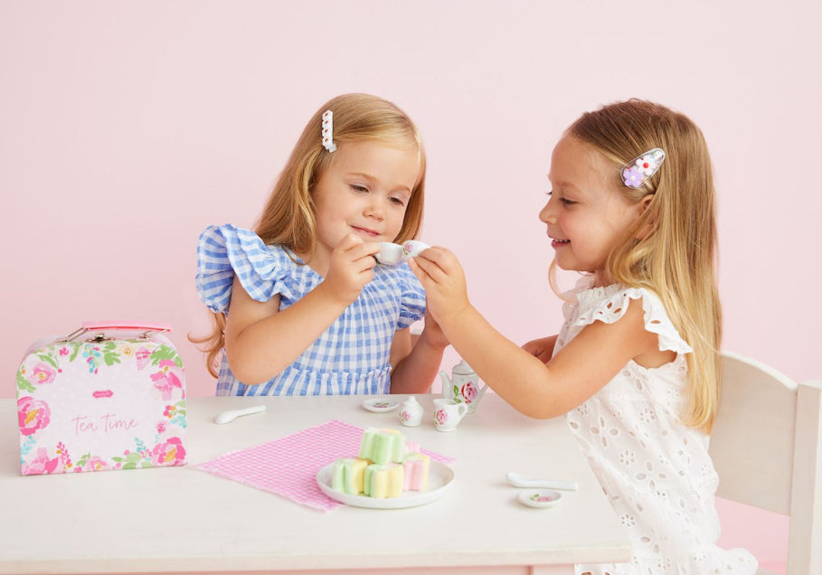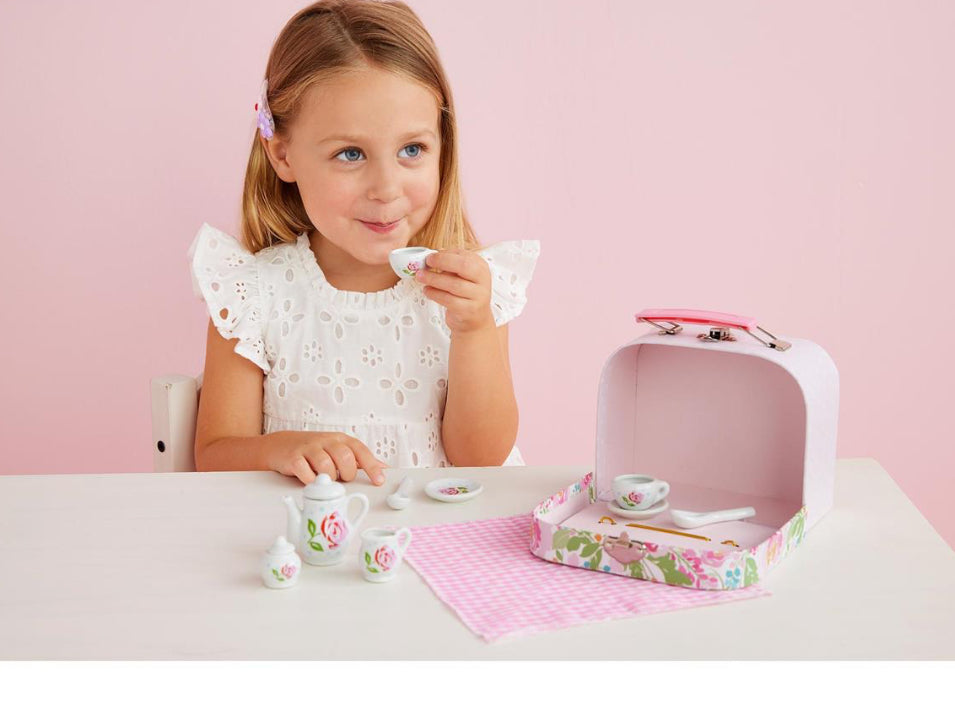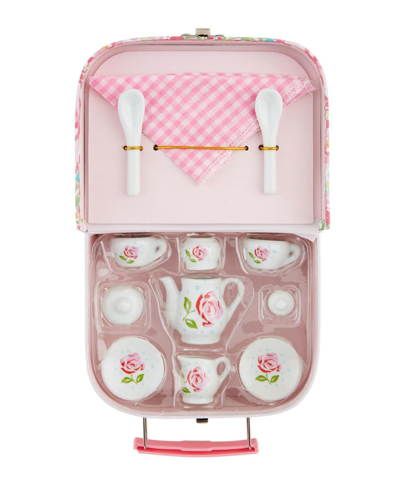 It's time for tea! Suitcase tote holds one tablecloth, ceramic tea pot with lid, two plates, two cups, two spoons, sugar bowl with lid and cream pitcher. Ages 3+