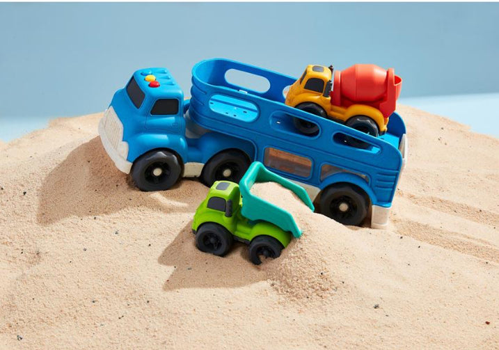 Recyclable bioplastic wheat straw vehicle with lights and sounds. Vroom! Pull tab to activate, batteries included. Ages 18+.